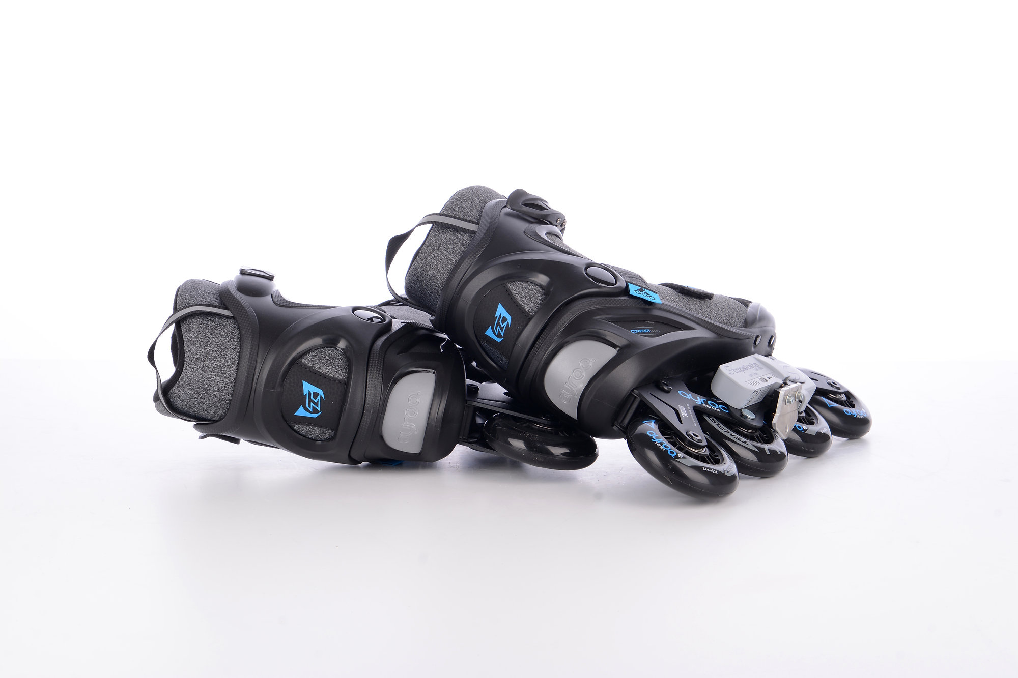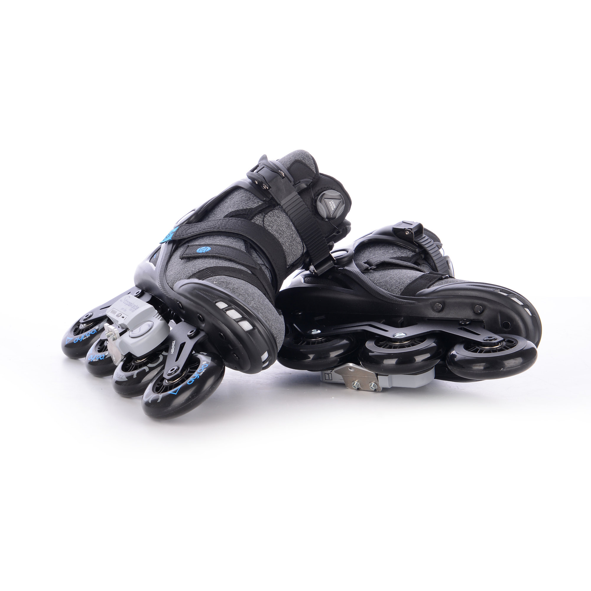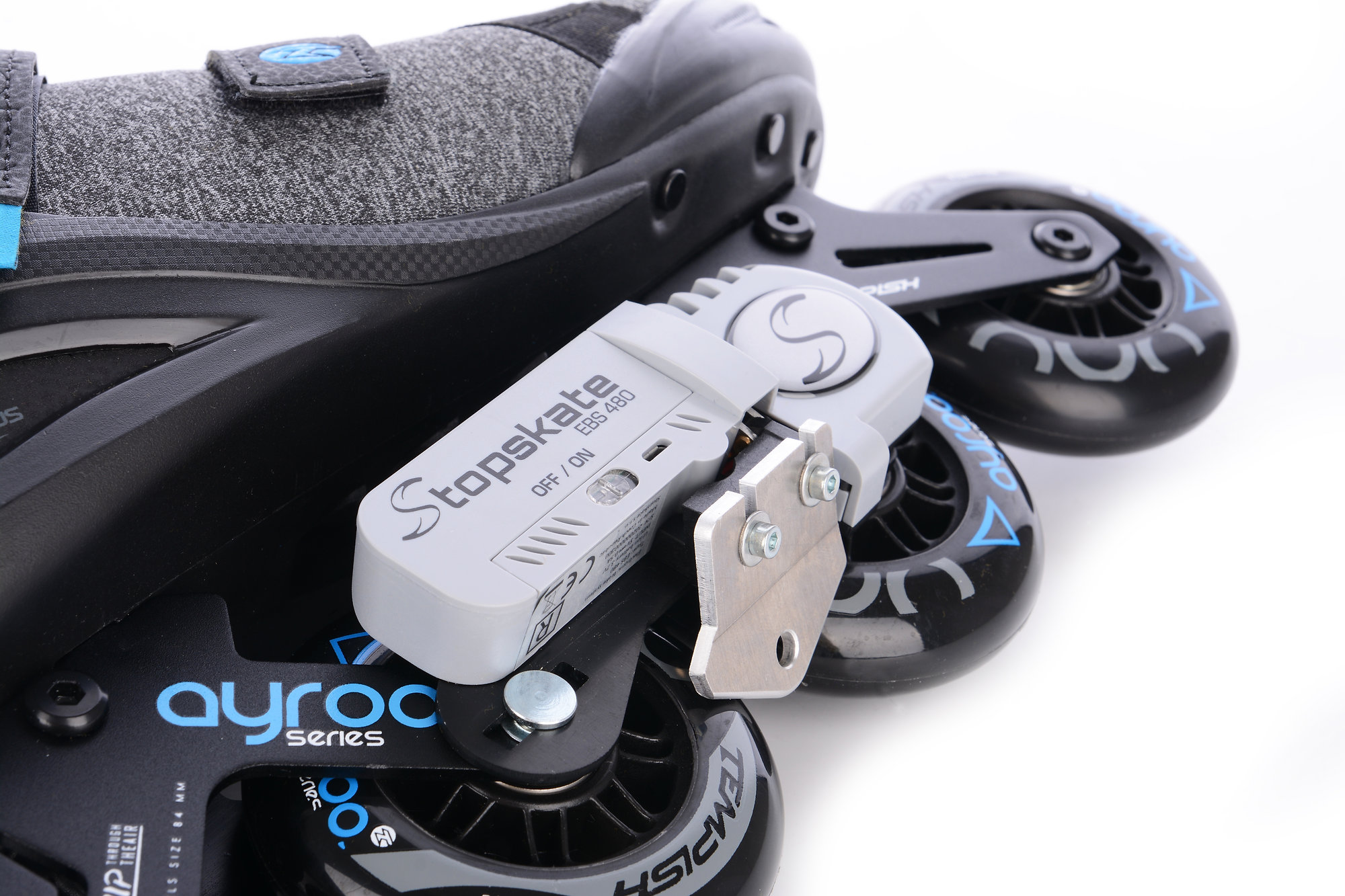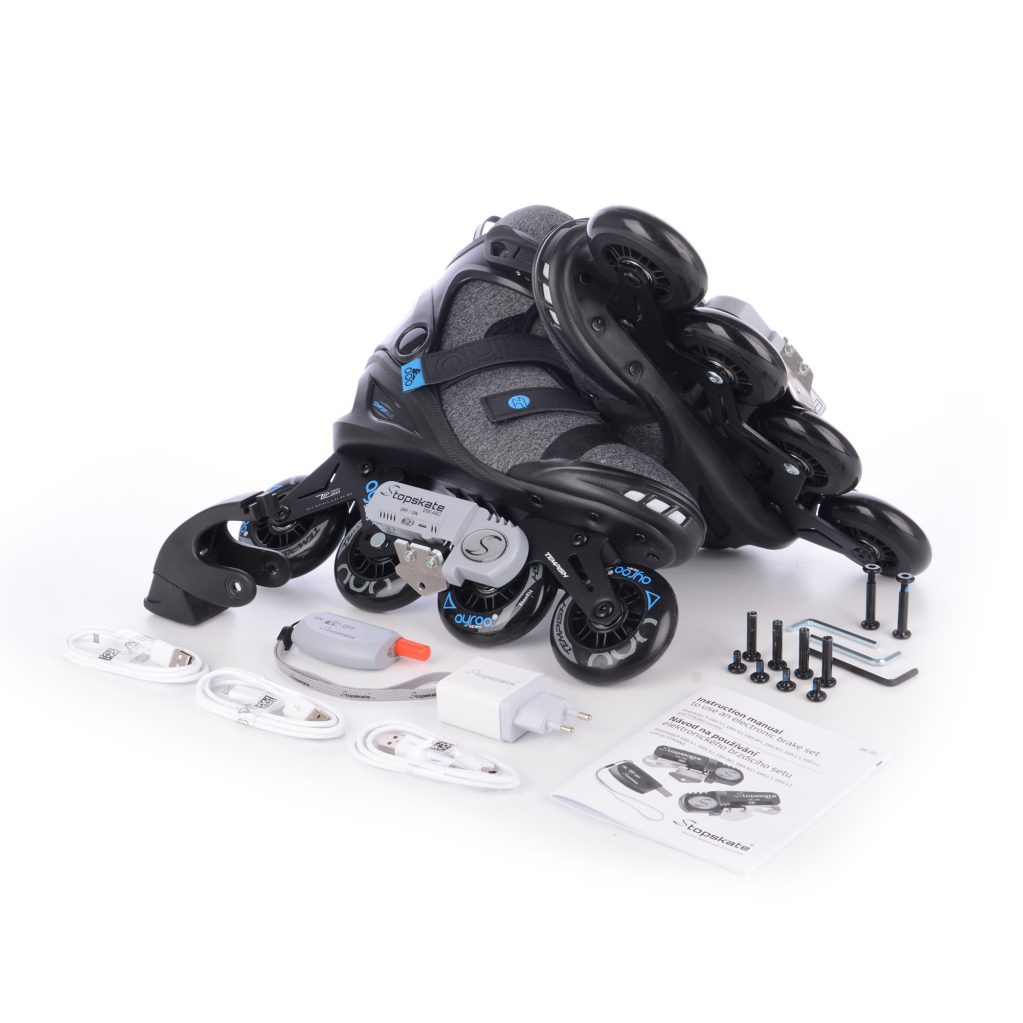 The skates are equipped with a revolutionary electromechanical braking system controlled by a wireless controller. Braking on these skates is now more comfortable, safer, simpler and more efficient than the classic brake located behind the rear wheel! More information about this patented Czech product can be found at: www.stopskate.com